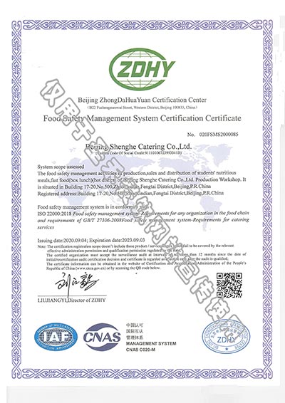 学生营养送餐HACCP管理体系验收证书
